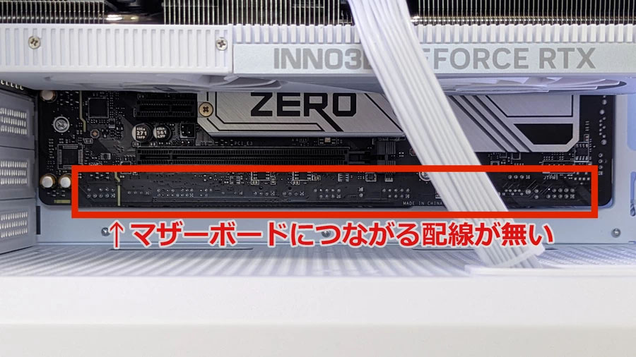 通常のPCでは、マザーボードの端子やケーブルは正面や内部から見えるように差し込みます。